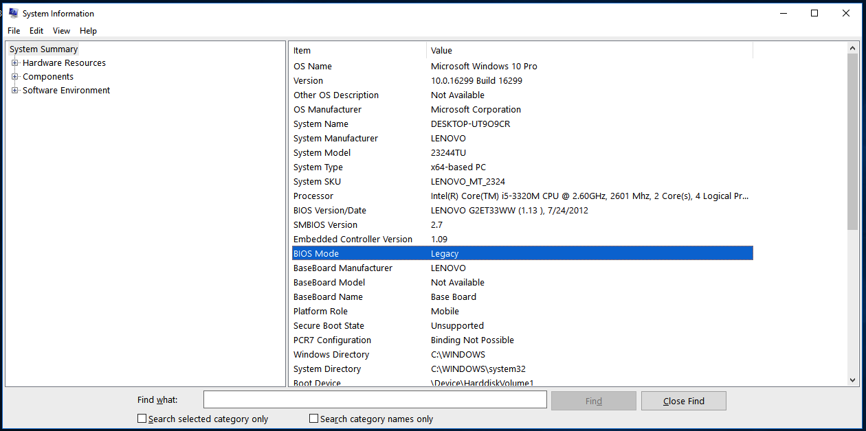 Look for BIOS Mode entry in the system information window. There you will see information and an entry about the BIOS MODE and you are looking for Legacy or UEFI.