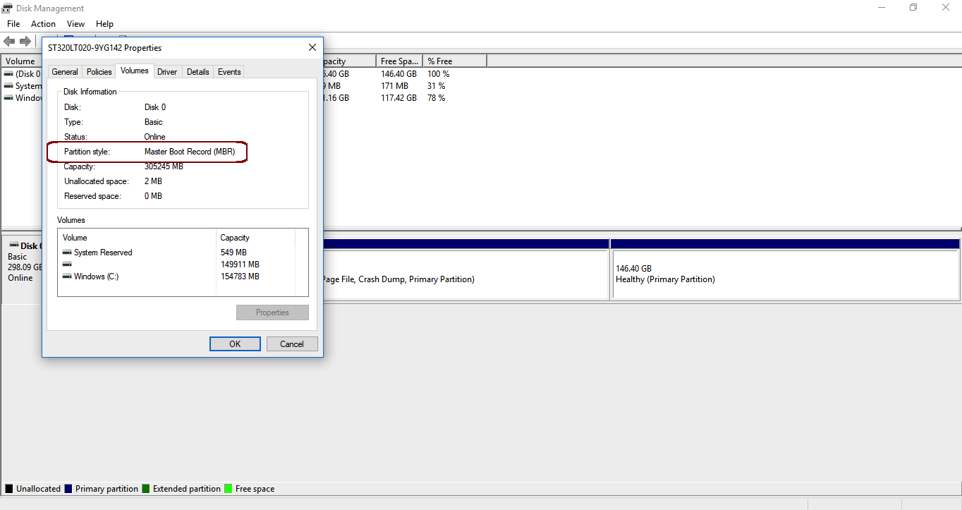 Once in the Properties view, click on the Volumes tab to find the Partition Style. My X230 has a Master Boot Record partition style. Make note of your style as you will need it later.